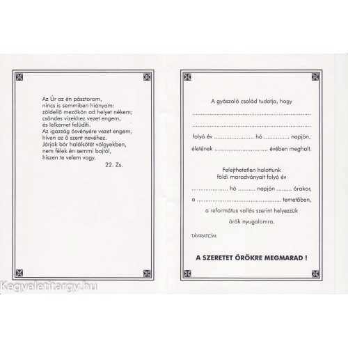 A temetés ill. a gyászmise időpontjáról tájékoztathatjuk hozzátartozóinkat, barátainkat. Értesítő református vallás szerint.