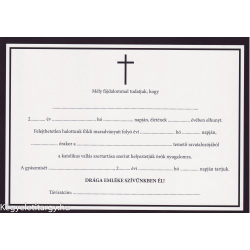 Kiragasztható gyászjelentés a/5-es méretben minőségi fényes papírra nyomtatva modern kivitelű katolikus vallás szerint.