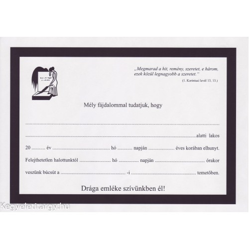 Kiragasztható gyászjelentés a/5-es méretben ofszet papírra szomorúfűz mintával református szertartás szerint.