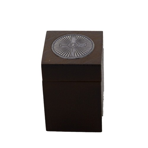 Mini urna fából, melyben a hamvak egy részét otthonunkban tárolhatjuk anélkül, hogy az hivalkodó lenne. Mini fa urna ón rátéttel pácolt kivitelben kereszt mintával.