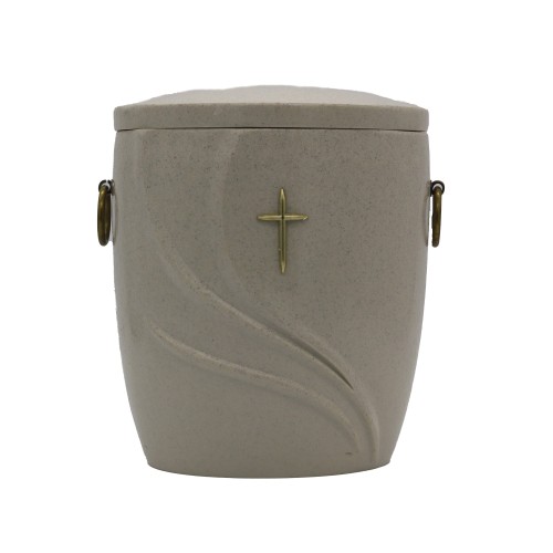 Urna kompozit anyagból, fehér márvány őrleménnyel dúsítva ívelt formával kereszt fémrátéttel.