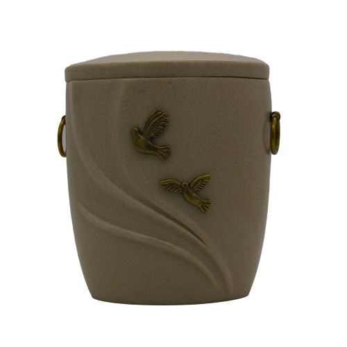 Urna kompozit anyagból, bézs márvány őrleménnyel dúsítva ívelt formával angyal/galamb fémrátéttel.