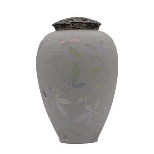 Exkluzív matt fehér üvegopál urna bambuszlevél mintával fém tetővel.