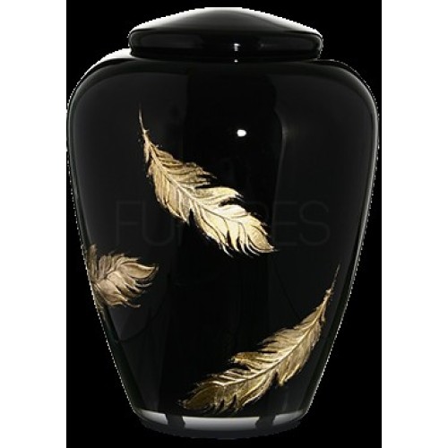 Exkluzív fekete üvegopál urna arany toll mintával.