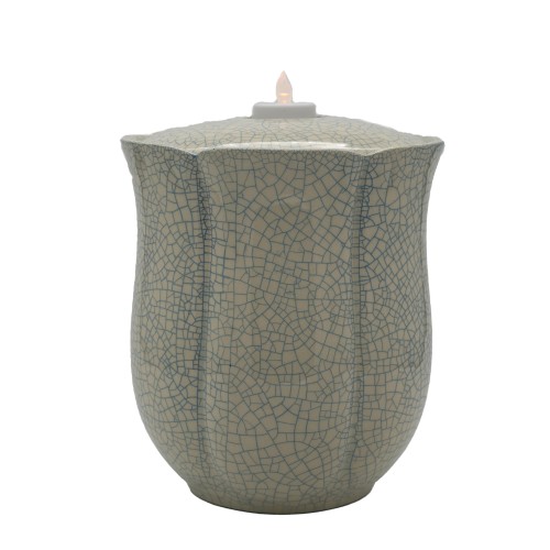 Kerámia urna virágkehely formájú repesztett bézs mázzal készítve barna erezettel.
