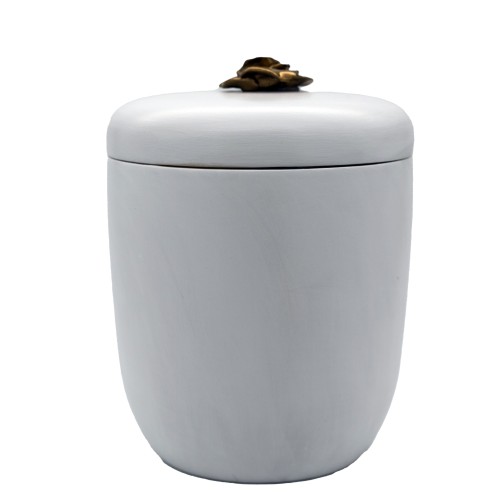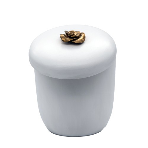 Kerámia urna matt felülettel arany rózsával a tetején.
