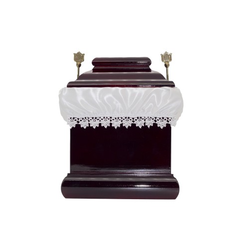 Négyszög alakú fából készült urna bordó színben.