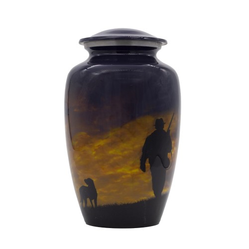 Amerikai stílusú fém urna exkluzív kivitelben hajnali vadászat képpel.