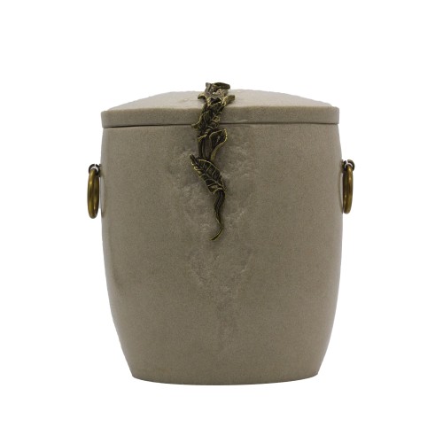 Urna kompozit anyagból, fehér márvány őrleménnyel dúsítva hasadék formával kála fémrátéttel.