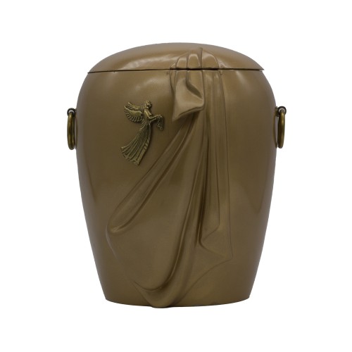 Urna kompozit anyagból, arany márvány őrleménnyel dúsítva gyászfátyol formával angyal/galamb fémrátéttel.