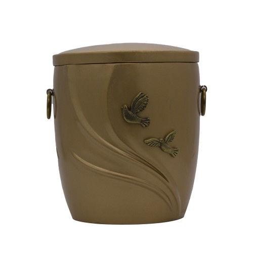 Urna kompozit anyagból, arany színben ívelt formával angyal/galamb fémrátéttel.