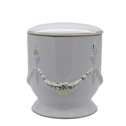 Aranyozott kerámia urna körbefutó koszorús mintával fehér színben.