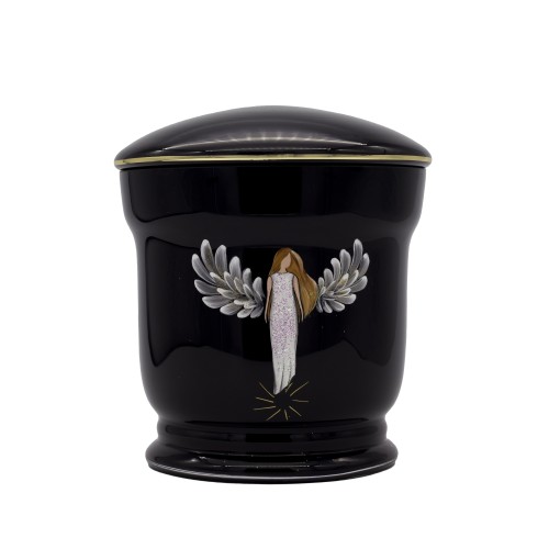 Üvegopál urna fekete színben kézzel festett angyal mintával.