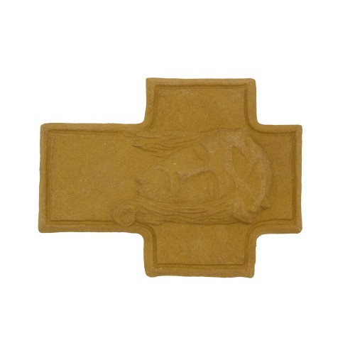 Fűrészporból készült fautánzatú koporsó dísz Jézus fej kereszten mintával.