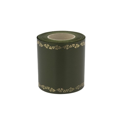 Nyomtatható szatén koszorúszalag arany mintával a szélein 10cm széles zöld színben. 25m hosszú tekercs.